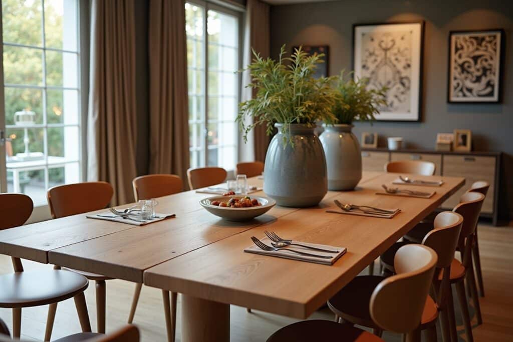 Betrachte deine bestehende Einrichtung. Welche Farben, Materialien und Formen dominieren? Ein Esstisch aus Holz kann entweder ein harmonisches Element sein, das sich nahtlos einfügt, oder ein bewusst gesetzter Kontrast. Helle Hölzer und klare Linien passen gut zu modernen und skandinavischen Stilen. Dunkle, massive Hölzer und rustikale Oberflächen sind ideal für Landhaus- oder traditionelle Einrichtungen. Industrielle Designs profitieren von der Kombination aus Holz und Metall.